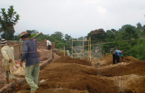 Dalam pelaksanaannya tentunya ada pekerjaan pengolahan gradasi tanah berkontur yaitu pemotongan tanah dan pengurugan tanah dalam istilah teknik di sebut juga cut and fill. Langkah awal sebelum pekerjaan galian tanah adalah dengan menentukan level dasar lantai kolam renang sebagai acuan untuk menentukan kedalaman air terhadap lantai teras rumah atau plaza yang pas, dengan memilih tapak tanah asli yang dominan dan usahakan jangan terlalu banyak di posisi tapak tanah urugan, sebab kalau terlalu banyak di posisi urugan / tanah yang labil akan menyebabkan konstruksi kolam renang suatu saat akan bergeser dan bisa jadi struktur beton lantai maupun struktur dinding akan patah dan menyebabkan kolam renang akan bocor. Sebab sering saya jumpai dilapangan kolam renang bocor salah satunya adalah penempatan kolam renang di area tanah urugan tanpa perlakuan yang tepat. Kalau memang terpaksa di area tanah urugan usahakan dengan perbandingan 30 persen tanah urugan : 70 persen tanah asli, dengan begitu konstruksi kolam renang masih di bilang aman ( tergantung ukuran kolam renang yang anda rencanakan ) . Setelah menentukan level dasar lantai dan penggalian maka sebelum dilakukan pekerjaan selanjutnya, maka pada bagian tanah urugan harus dilakukan pemadatan tanah dan perlu di kasih pondasi telapak ( foot plate ) pada bagian tanah uruganya dengan jarak sesuai panjang yang di tentukan. Biar lebih aman lagi pada bagian tanah yang bawah atau bagian tanah yang miring di kasih dinding penahan tanah ( DPT ), fungsinya sebagai penahan beban tanah dan sekaligus bisa sebagai perkerasan di samping kolam dan sekaligus bisa di fungsikan sebagai plaza samping kolam renang dan ruang untuk penempatan pompa dan filter